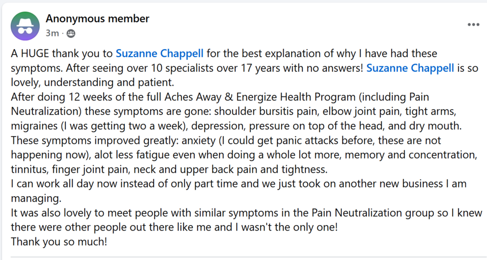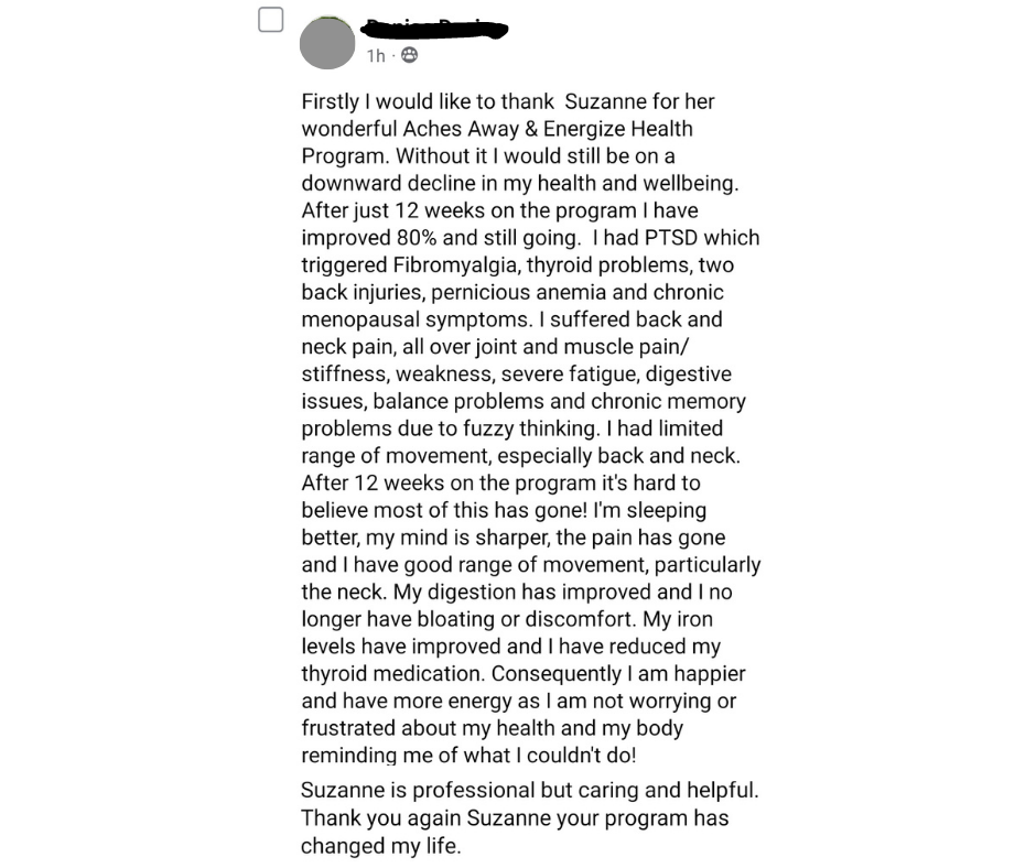 If you would like the Google Document that tells you all about my Aches Away & Energize Health Program, please email me suzanne@achesawayandenergize.com (that's a z in energize!) with the words 'Google Doc' and your first and last name and I'll send it to you.